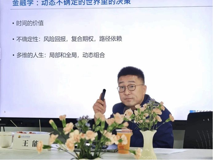 在聆听了与会同学的生涯规划后,王能博士进一步探讨经济学框架,以“第一性原理”为例,结合自身转型故事,引出了好奇心与认知突破的价值和认知水平对人生上限的优化作用。王能博士认为,人生重大决策涉及机会成本与优化问题,应理性分析目标函数,避免盲目跟风。