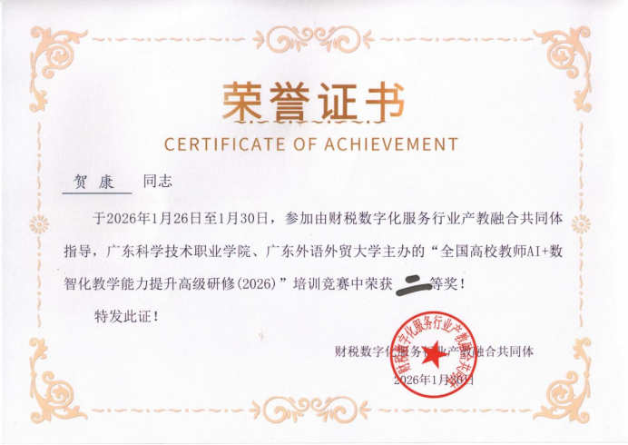 贺康博士参与了“高校教师AI+数智化教学能力提升高级研修班”的系统学习,完成了AI智能体开发、大数据财务分析、Power BI可视化应用等核心课程的研修。在研修期间举办的技能竞赛中,贺康博士凭借扎实的专业素养和出色的实操表现荣获二等奖,并在结业仪式上作为优秀教师代表发言,分享了其在AI数智化教学能力提升方面的学习心得与实践规划,充分展现了商学院教师的专业风采与积极进取的精神风貌。