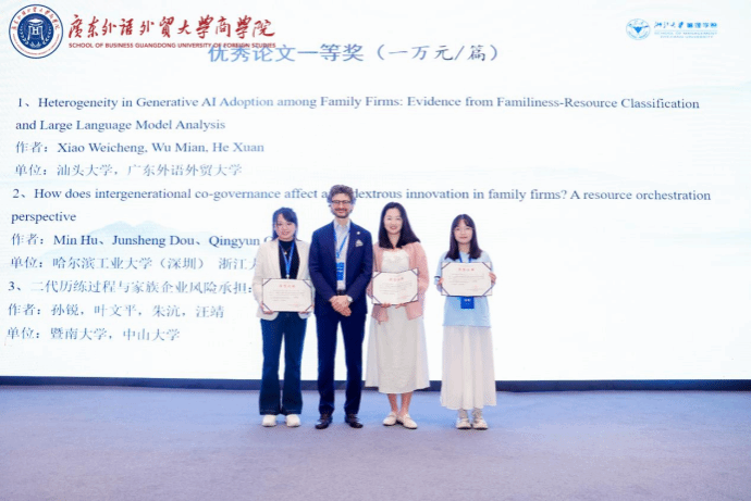由肖炜诚老师、商学院研究生吴冕及广东外语外贸大学何轩教授合作的论文“Heterogeneity in Generative AI Adoption among Family Firms: Evidence from Familiness-Resource Classification and Large Language Model Analysis”获优秀论文一等奖。