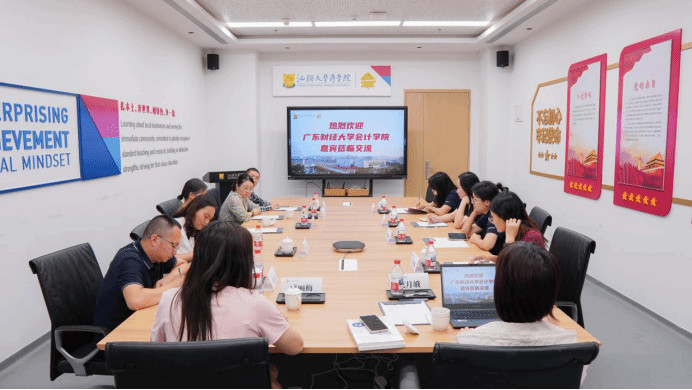 在座谈交流环节,双方聚焦智能会计人才培养路径、课程体系重构、国际化合作模式等关键议题进行了深入探讨。针对“AI+会计”转型,双方就智能会计课程模块设置、实践教学平台搭建、行业资源对接等问题交换了具体思路;在国际化交流方面,分享了师生互访、联合培养、国际课程共建等经验,探讨了资源共享、合作举办学术活动的可行性。龙月娥表示,广东财经大学会计学院在英文授课师资的培养与储备上形成了独特优势,值得商学院学习借鉴。