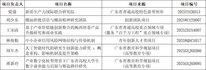 近期,广东省教育厅公布了2025年度普通高校重点科研平台和项目立项名单,我院喜获6项立项。其中,梁强教授负责的“新质生产力国际联合研究院”获批广东省普通高校特色新型智库,胡少东教授主持的“潮汕侨批话语与潮商精神研究团队”项目成功入选广东省普通高校创新团队项目(社科),实现科研平台与团队建设双丰收。王宋涛副教授主持的项目“基于产业价值链创新整合的揭西炒茶产品升级研究和商业实践”获批服务“百千万工程”重点领域项专项;林俊勤博士主持的项目“中小企业信用风险网络结构与传染机制”获批青年创新人才类项目;周军杰教授和蒋新玲博士主持的项目“人工智能时代的研究生创新能力研究 :概念重构、影响机制及提升策略”“产业数字化转型背景下广东省高校大学生数字就业能力识别与塑造路径研究”分别获批广东省教育科学规划项目(高等教育专项)。
