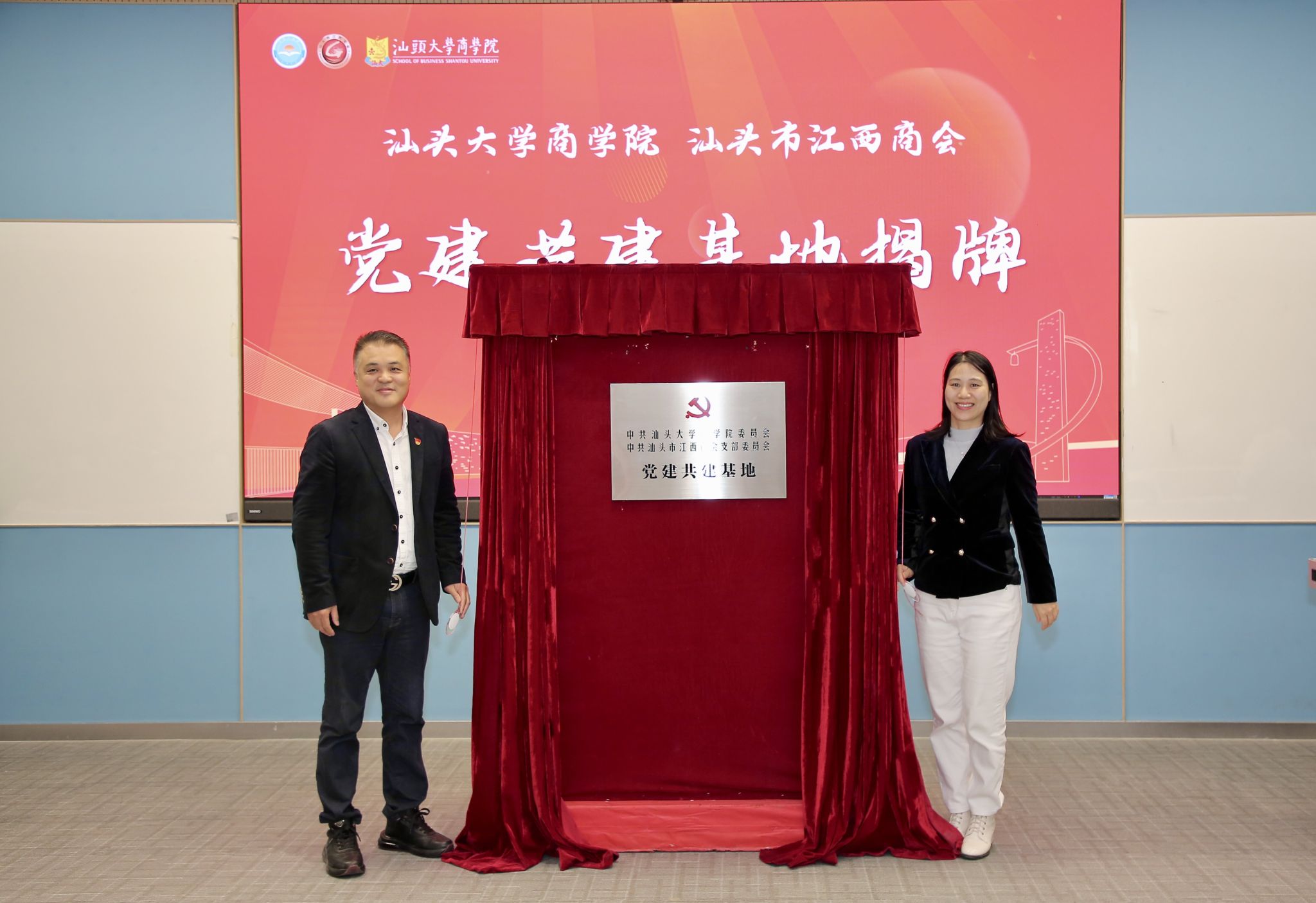 随后,汕头大学商学院党委副书记苏冰钿与汕头市江西商会党支部书记彭魁共同为党建共建基地揭牌。这标志着双方党建合作迈入新的阶段,双方将以党建为引领,推动校企合作走深走实,让红色引擎成为推动民营经济高质量发展、培育新质生产力的强大动力。