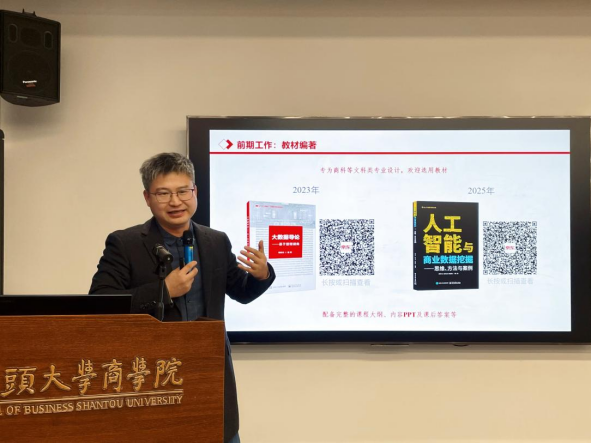 接着,商学院周军杰教授带来了题为《“机器学习+计量经济模型”:一种社会科学研究的新范式》的专题分享。周教授首先向在座师生阐述了社会科学研究的三要素:客观事实、科学理论与方法技巧。随后,他系统介绍了“机器学习+计量经济模型”这一融合性研究框架。该模型基于机器学习的方法,从大数据中提取具有高度上下文意义的信息,并通过实验研究设计与计量经济建模,为商业、消费者及社会等领域的政策分析与决策支持提供了系统、可操作的研究路径。