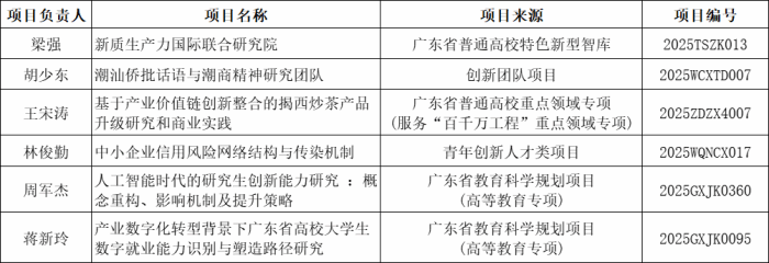 近期,广东省教育厅公布了2025年度普通高校重点科研平台和项目立项名单,我院喜获6项立项。其中,梁强教授负责的“新质生产力国际联合研究院”获批广东省普通高校特色新型智库,胡少东教授主持的“潮汕侨批话语与潮商精神研究团队”项目成功入选广东省普通高校创新团队项目(社科),实现科研平台与团队建设双丰收。王宋涛副教授主持的项目“基于产业价值链创新整合的揭西炒茶产品升级研究和商业实践”获批服务“百千万工程”重点领域项专项;林俊勤博士主持的项目“中小企业信用风险网络结构与传染机制”获批青年创新人才类项目;周军杰教授和蒋新玲博士主持的项目“人工智能时代的研究生创新能力研究 :概念重构、影响机制及提升策略”“产业数字化转型背景下广东省高校大学生数字就业能力识别与塑造路径研究”分别获批广东省教育科学规划项目(高等教育专项)。
