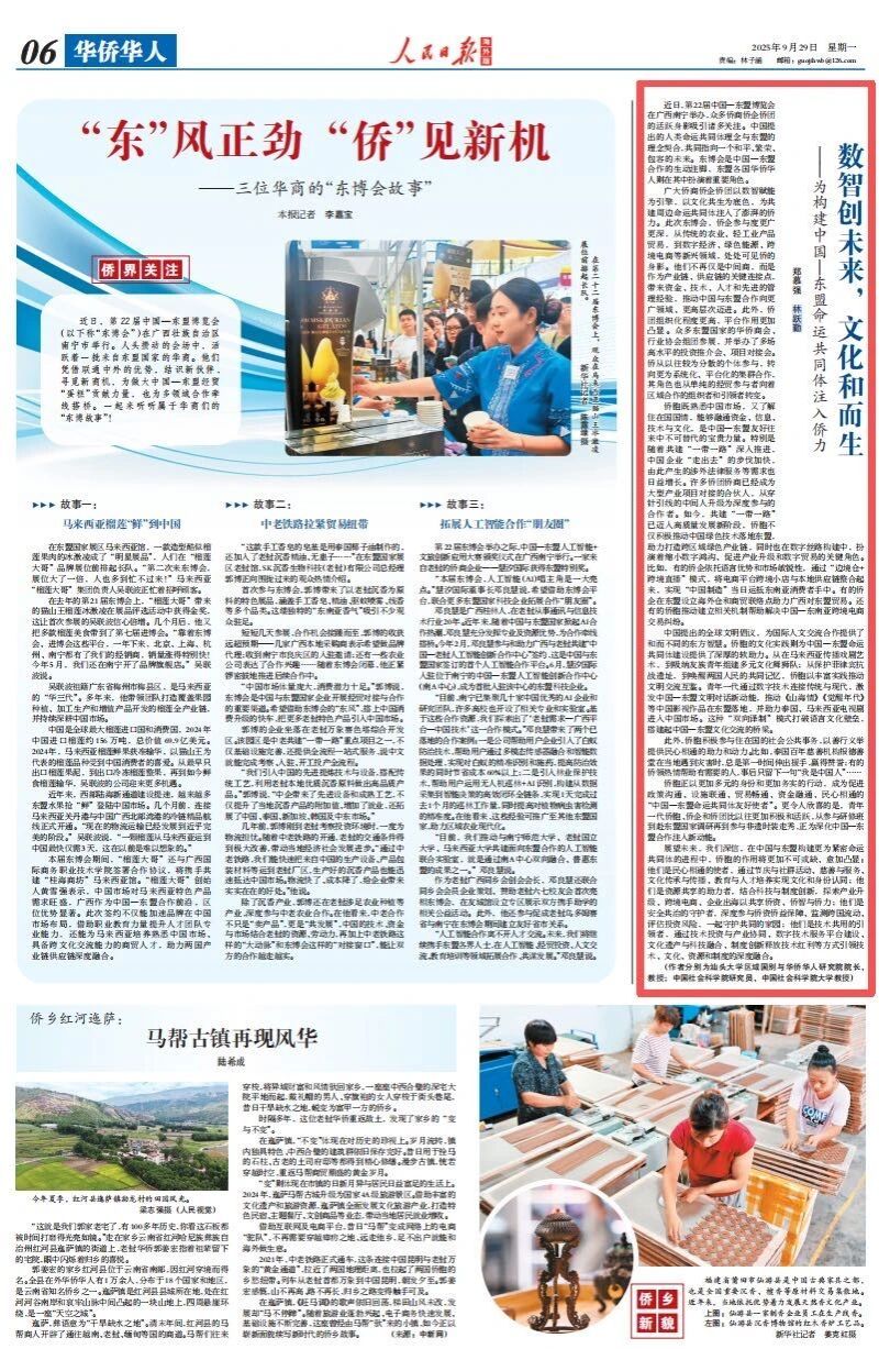 2025年9月29日,《人民日报》(海外版)第06版:华侨华人刊发由郑慕强教授和林跃勤教授合作撰写的理论文章《数智创未来,文化和而生——为构建中国—东盟命运共同体注入侨力》,全文详见如下(附原文链接)。