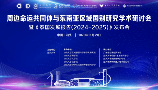 在此背景下,由汕头大学主办,区域国别与华侨华人研究院、商学院、文学院、法学院和新闻学院联合承办的周边命运共同体与东南亚区域国别研究学术研讨会暨《泰国发展报告(2024-2025)》发布会,将于2025年11月29日9:00在汕头大学桑浦校区图书馆报告厅举行。