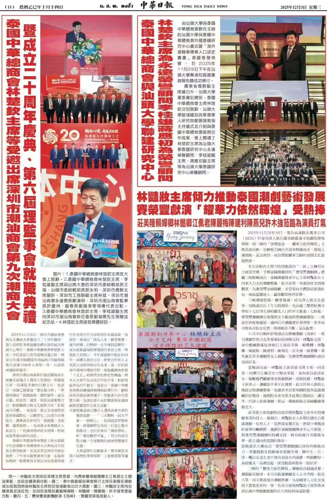 2025年12月3日,中华日报(TONG HUA DAILY NEWS)刊登文章《泰國中華總商會與汕頭大學聯建研究中心 林楚欽主席為永遠榮譽顧問 李桂雄 蔣應初為榮譽顧問》。
