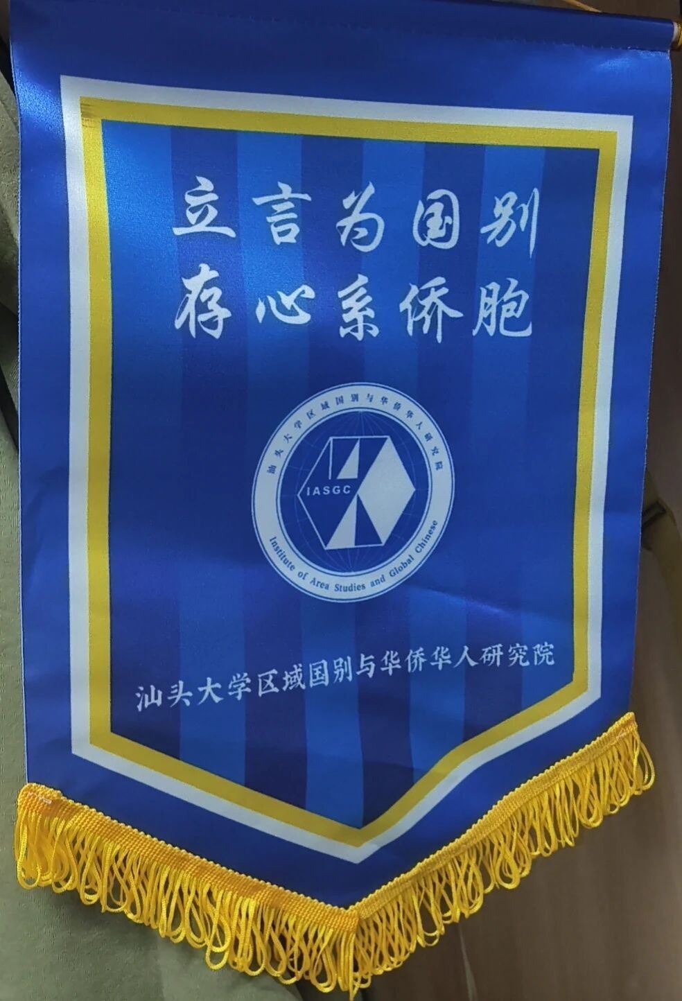 发布会上,汕头大学区域国别与华侨华人研究院的研究成员向杨经纬先生敬赠了一面写有“立言为国别,存心系侨胞”的旗帜。这十个字,既是我院立足学术、关怀侨胞的宗旨体现,也寄托了对如杨经纬先生这样以文化行动凝聚族群、沟通世界的实践者的敬意。这份赠礼,象征着学术界与文化推广一线之间的共鸣与支持,彰显了我院对潮汕文化发展、华侨华人社群联结的持续关注。