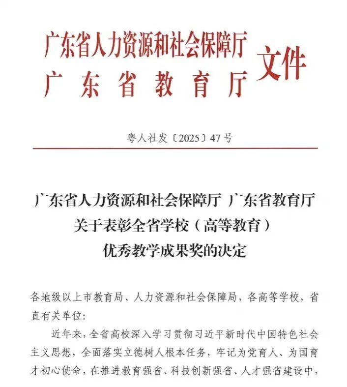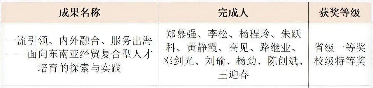 近日,广东省人力资源和社会保障厅、广东省教育厅联合发布了《关于表彰全省学校(高等教育)优秀教学成果奖的决定》(粤人社发〔2025〕47号),我院郑慕强教授主持,李松、杨程玲、朱跃科、黄静霞、高见、路继业、邓剑光、刘瑜、杨劲、陈创斌、王迎春等多位老师共同完成的《一流引领,内外融合、服务出海-面向东南亚经贸复合型人才培养的探索与实践》荣获省级教学成果一等奖。