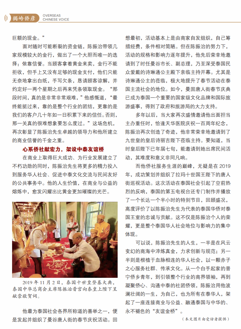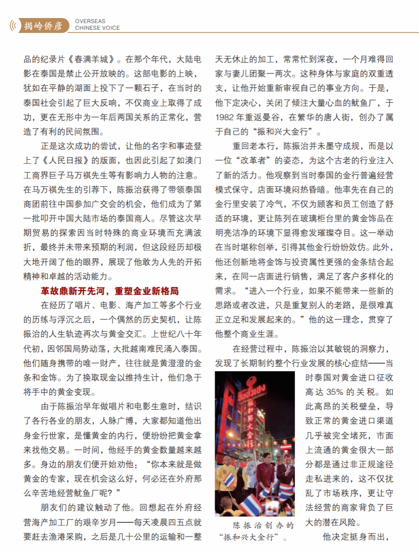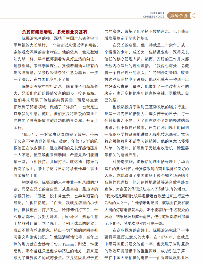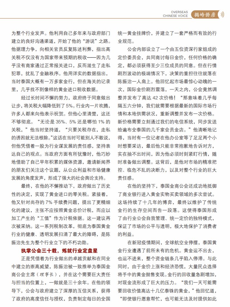 陈振治主席简介:陈振治,1941年出生,祖籍广东普宁军埠镇大长陇村。现任泰国金业公会主席、泰国中华总商会永远荣誉主席、振和兴大金行有限公司董事长。陈振治先生以其卓越的远见和坚毅的魄力,推动了泰国黄金行业的现代化改革,被誉为行业的领航人。他数十年如一日地服务泰国华人社会,积极促进中泰文化交流与民间友好,是备受中泰两国人民敬重的著名侨领。