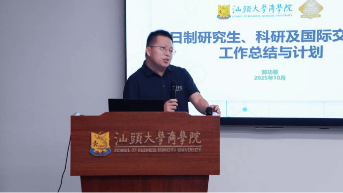 最后,梁强院长作 “十四五”规划重点指标完成情况总结及本学期重点工作部署。围绕“十四五”规划建设目标,梁强细致分析了各项重点工作的落实成效与努力方向:“十四五”期间,学院在一流专业建设、科学研究、平台建设等方面效果显著,学科排名持续向好,要锚定目标补短板,优化师资梯队建设、强化教育教学成果培育、推进学位点建设,对于落后指标要查找差距、靶向发力、精准破局。梁强表示,要紧紧围绕汕头大学综合改革方案建设目标,以学校高等教育人才培养综合改革试点为契机,提升站位,提前谋划,突出重点,量化目标,认真做好第六轮学科评估成果梳理和“十五五”分规划编制等重要工作,为学校的高质量发展展现“商院作为”。
