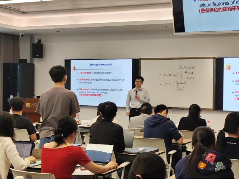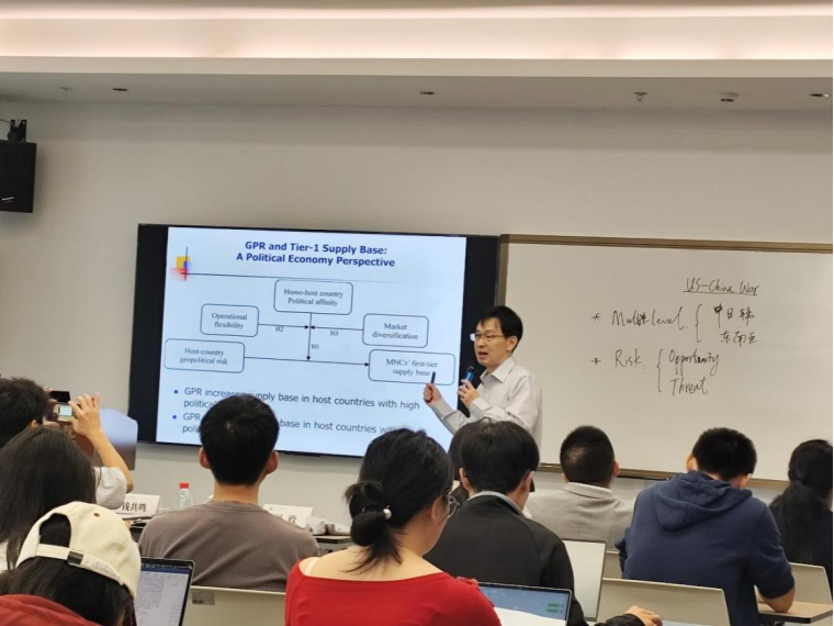 讲座伊始,周政教授首先回顾了中国特色学术研究的发展历程,提出三类具有中国特色的研究方法:“中国特色概念化”、“中国特色微观化”、“中国特色情景化”。同时,周教授指出当前中国特色研究面临的现实挑战。随着中国经济增长放缓,“中国奇迹”相关研究关注度下降;中美关系变化及中国投稿量激增,导致部分国际期刊出现投稿壁垒;此外,外国游客入境数量回落、外资流入减少等现象,也反映出国际社会对中国相关研究的关注热度有所调整。面对转型期的挑战,周教授提出了全球视野下的三大前沿研究方向。在数字化与AI领域,AI对就业市场的差异化影响、社会公平的重塑作用等议题极具研究价值,其核心在于提炼数字化“信息不对称弱化”等独特属性;在自主创新领域,针对中国专利“数量高、质量低”的现状,探讨如何通过优化FDI引入等方式提升核心创新能力,成为兼具现实意义与学术价值的重要课题;在地缘政治风险领域,打破传统研究局限,提出将风险划分为同盟国机遇与敌对国威胁的二元视角,通过联合国投票数据、媒体评价等量化方式区分国家关系类型,为跨国企业供应链决策提供新的理论支撑。