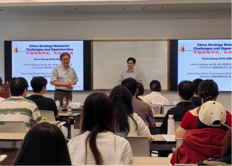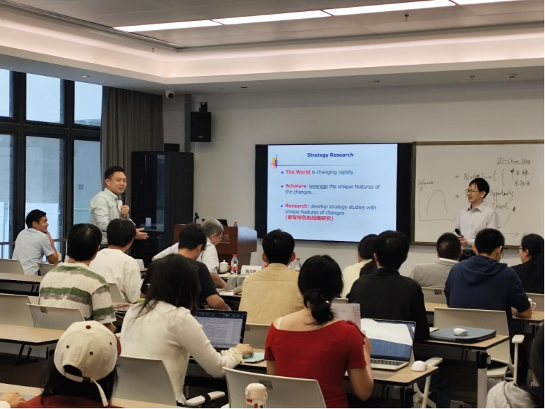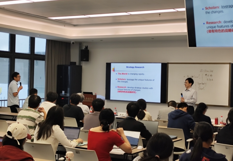2025年11月14日上午,商学院企业管理系学术讲座(第216期)在东海岸校区行政楼328会议室成功举办。本次讲座特邀香港大学周政教授作为主讲嘉宾,做了题为《中国战略研究之挑战与机遇》的学术分享。讲座由商学院钱共鸣教授主持,商学院院长梁强、副院长郭功星、企业管理系负责人刘久兵以及宋丽红、邹立凯、蔡创能、田鼎、李梦琳等教师和五十余位学生参与交流。