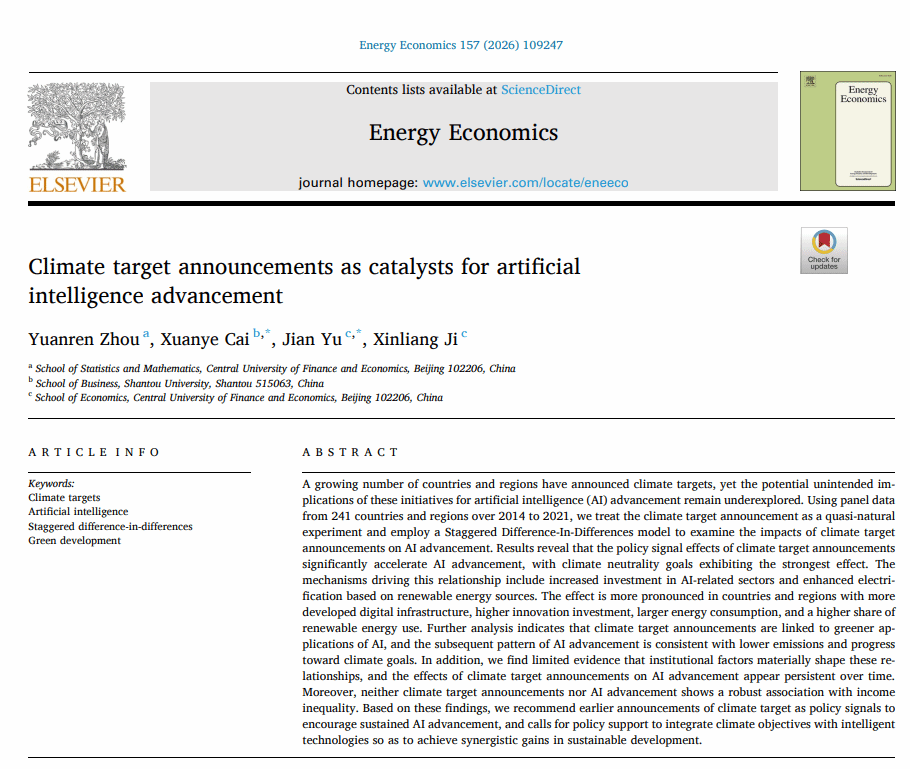 近日,我院青年教师蔡铉烨作为第一通讯作者合作撰写的论文Climate target announcements as catalysts for artificial intelligence advancement被中科院一区TOP期刊