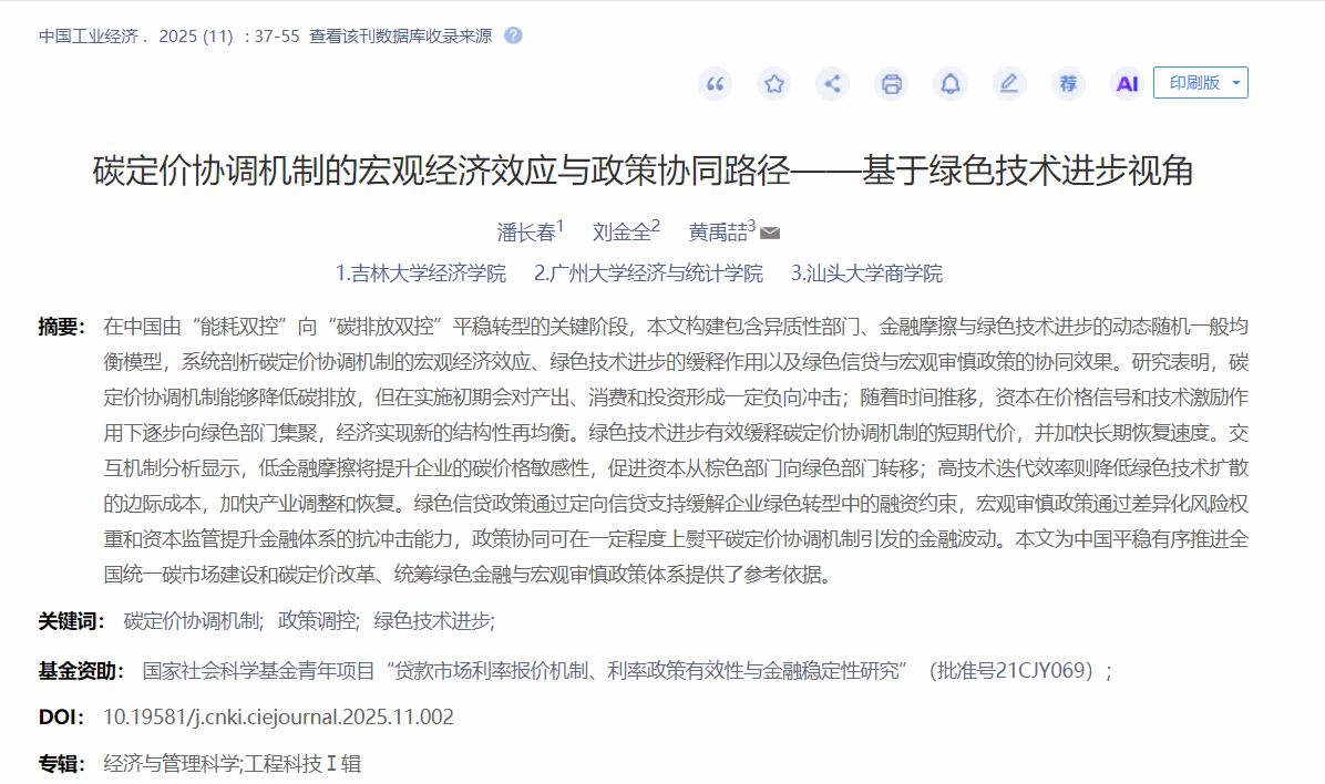 近日,我院青年教师黄禹喆作为通讯作者合作撰写的论文《碳定价协调机制的宏观经济效应与政策协同路径——基于绿色技术进步视角》被汕头大学首选期刊《中国工业经济》接收并发表。